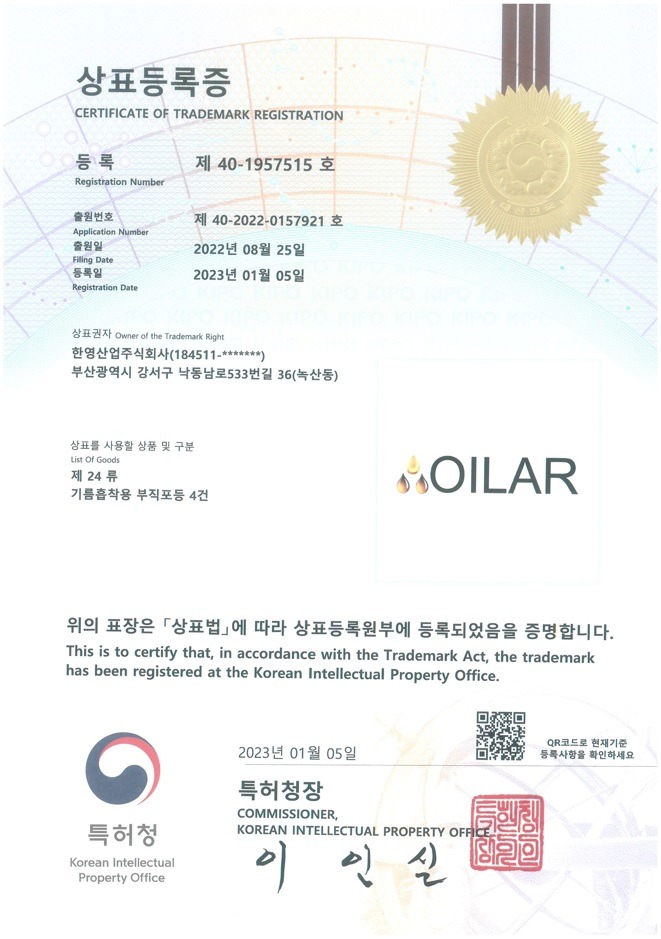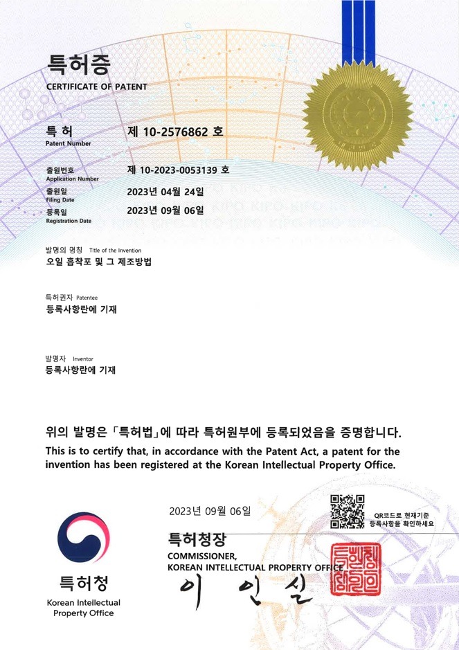 - 고효율 오일 흡착포 개발 및 OILAR 상표 출원