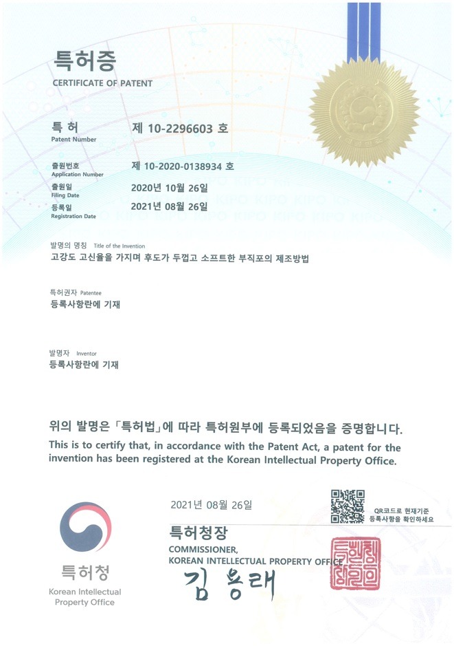 - 고강도 고신율을 가지며 후도가 두껍고 소프트한 부직포의 제조방법 특허 출원