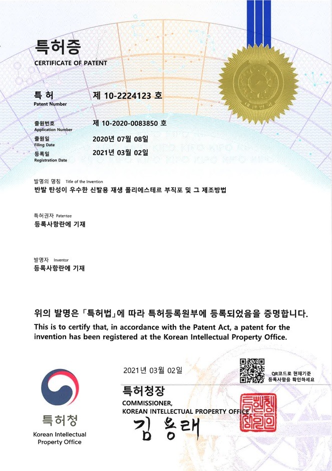 - 반발 탄성이 우수한 신발용 재생 폴리에스테르 부직포 및 그 제조방법 특허 출원