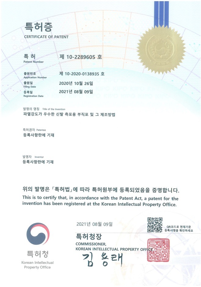- 신발 보강재용 부직포 특허 출원