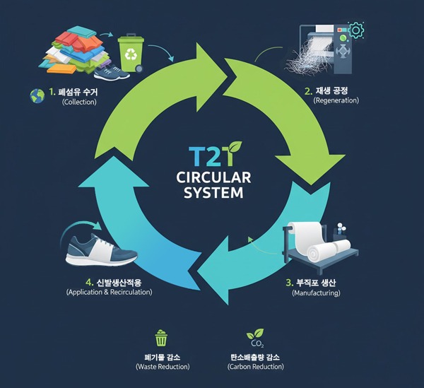 HANYOUNG은 사용 후 버려지는 섬유 폐기물(Textile Waste)을 다시 고품질의 신발용 부직포 원료로 되돌리는 T2T(Textile-to-Textile) 재활용 시스템을 구축했습니다. 이는 단순한 재활용을 넘어, 석유 기반 신규 원료 사용을 최소화하고 섬유 폐기물 매립 문제를 근본적으로 해결하는 가장 진보된 순환경제 방식입니다. - 지속가능성을 위한 품질: