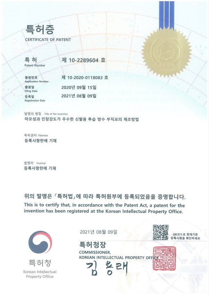 - 마모성과 인장강도가 우수한 신발용 투습 방수 부직포의 제조방법 특허 출원