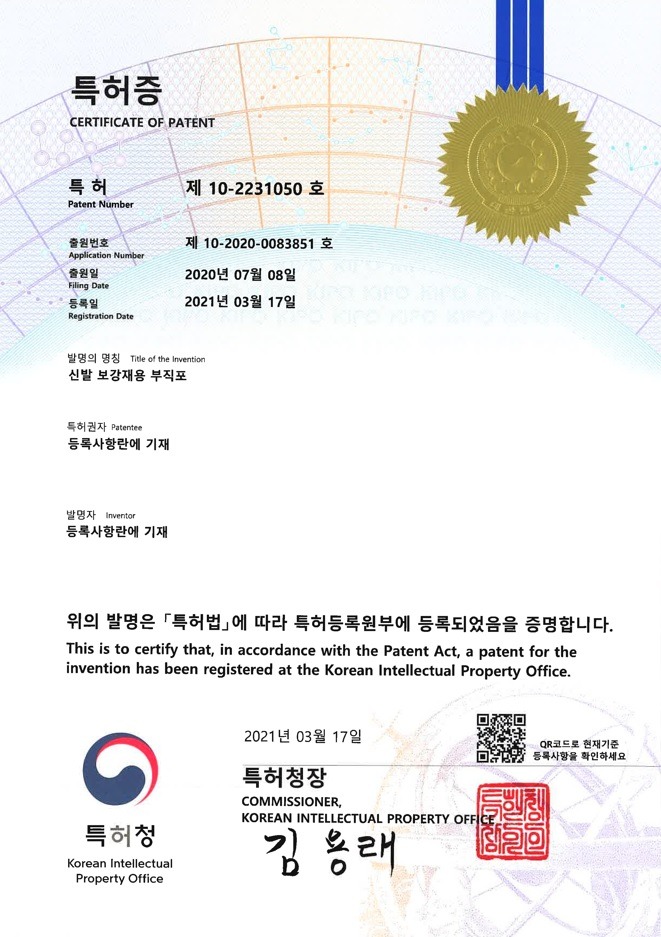 - 신발 보강재용 부직포 특허 출원