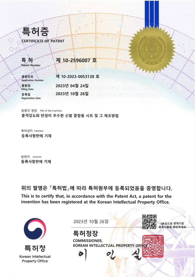 - 충격강도와 탄성이 우수한 신발 중창용 시트 개발 및 특허 출원